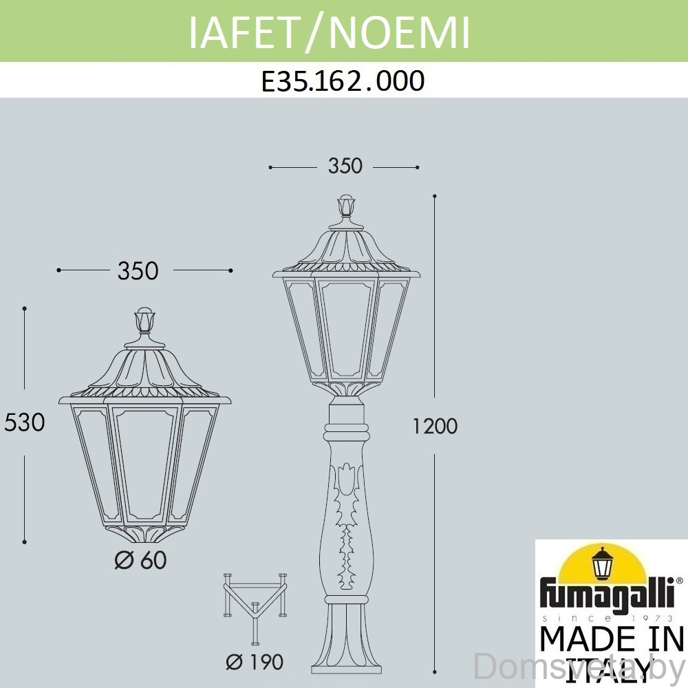Садовый светильник-столбик FUMAGALLI серии NOEMI, модель IAFET/NOEMI. Садовый фонарь с 1 венчающим светильником большого размера в на классическом садовом столбике IAFET высотой 0,7 м (+высота фонаря). Предназначен для освещения парковых дорожек, cкверов, садовых и ландшафтных композиций, и других общественных пространств. Изготовлены в Италии, по уникальным технологиям "FUMATECH" из современного композитного полимера RESIN. Этот материал в 5 раз прочнее металла, не ржавеет, не окисляется, не выгорает на солнце, его не нужно красить. Все светильники пыле-влаго защищены по стандарту IP55 (Пылезащищенные, защита от водяных струй с любого направления). Рассеиватель выполнен из антивандального, не мутнеющего и не горючего PMMA (ПолиМетилМетаАкрилат). Срок службы светильника - не менее 20 лет. Температура использования от -60 до +90. В серии NOEMI есть садовые фонари в настенном (OFIR/NOEMI, MIRRA/NOEMI) подвесном (SICHEM/NOEMI) и наземном исполнении (IAFAET.R/NOEMI, ALOE.R/NOEMI, ARTU/NOEMI, GIGI/NOEMI, RICU/NOEMI, NEBO/OFIR/NOEMI 1L, NEBO/OFIR/ANNA 2L, TABOR/ADAM/NOEMI 3L) со столбами разной высоты, с разным количеством и конфигурацией голов. Консоли настенных фонарей и кронштейны светильников на столбах освещения могут устанавливаться в положение вверх и вниз. Столбы выше 150 см имеют в основе мощную стальную трубу с двойной оцинковкой. При заказе требуется выбрать цвет корпуса, цвет плафона и тип патрона (Е-27 или LED GX-53). Возможен светодиодный вариант. По стилю и дизайну серия уличных светильников NOEMI похожа на светильники среднего размера серии RUT и на светильники малого размера серии ANNA. По размеру относится к большим парковым светильникам как серия SIMON и GLOBE 400.
