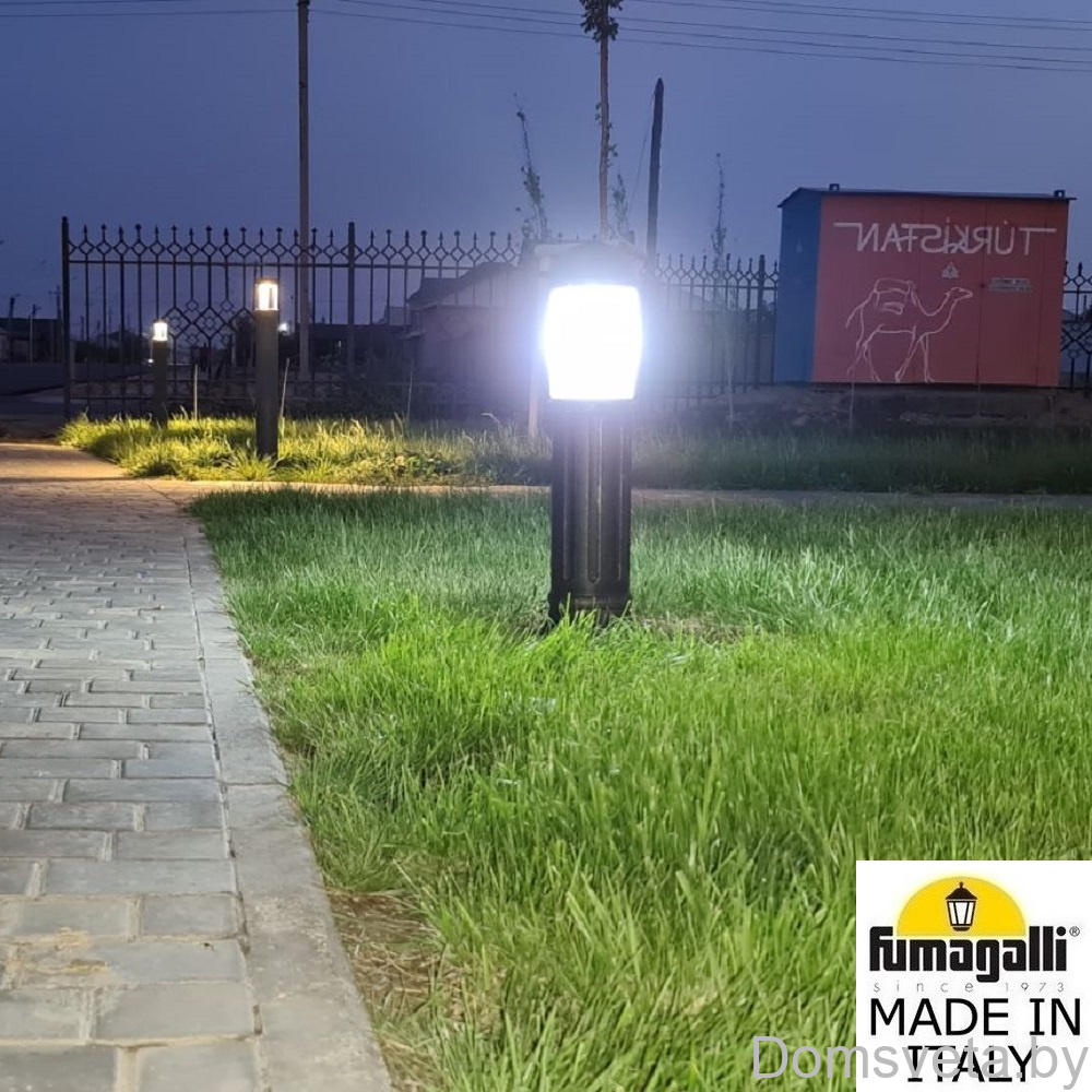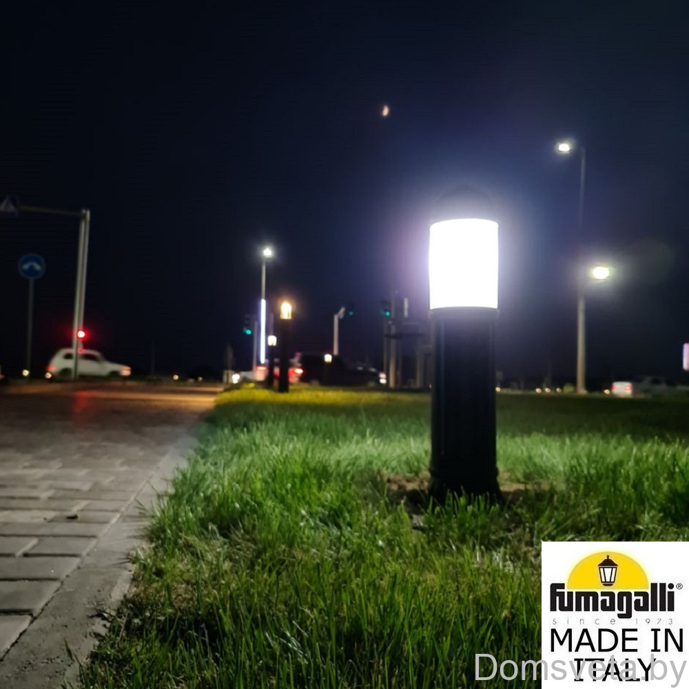 Садовый светильник-столбик FUMAGALLI серии SAURO, модель SAURO 800 - изготовлены в Италии. Используются для освещения парковых дорожек, газонов, парковок, набережных, как элементы ландшафтного и светового дизайна. Укомплектован цилиндрическим рассеивателем (рефлектором) белого цвета, который распределяет свет лампы и исключает эффект ослепления. Корпус изготовлен из современного вандалостойкого, негорючего полимера RESIN. Прочного, окрашенного в массе, не ржавеющего, не выгорающего на солнце, не проводящего электричество. Все светильники пыле-влаго защищены по стандарту IP55. Рассеиватель выполнен из толстого антивандального, не мутнеющего и не горючего PMMA (ПолиМетилМетаАкрилат). Срок службы светильника - не менее 20 лет, в течении которого парковый светильник не нужно красить и как либо обслуживать. Температура эксплуатации от -60 до +90. При заказе требуется выбрать цвет корпуса, цвет плафона и тип патрона. Серия SAURO включает в себя светильники высотой 0,50 метра, 0,80 метра, 1,10 метра, а так же уличный светильник MIRELLA с установкой на стену. Дополнительно можно использовать столбики- ограждения NARDO высотой 60 и 90 сантиметров. Между столбиков можно натягивать цепочку. Также светильник-столбик с цоколем Е27, может комплектоваться хромированным или белым рассеивателем на лампу. Закладные крепежные элементы паркового столба SAURO - в комплекте.