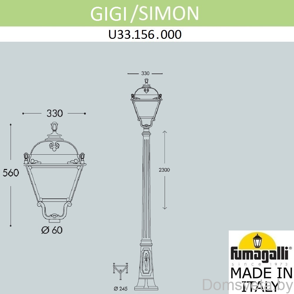 Садово-парковый фонарь FUMAGALLI среднего размера серии SIMON, модель GIGI/SIMON. Парковый фонарь с 1 светильником большого размера в на классическом столбе GIGI высотой 1,75 м (+высота фонаря). Предназначен для освещения парковых дорожек, cкверов, садовых и ландшафтных композиций, и других общественных пространств. Используется в качестве основного уличного освещения на городских улицах и площадях. Изготовлены в Италии, по уникальным технологиям "FUMATECH" из современного композитного полимера RESIN. Этот материал в 5 раз прочнее металла, не ржавеет, не окисляется, не выгорает на солнце, его не нужно красить. Все светильники пыле-влаго защищены по стандарту IP55 (Пылезащищенные, защита от водяных струй с любого направления). Рассеиватель выполнен из антивандального, не мутнеющего и не горючего PMMA (ПолиМетилМетаАкрилат). Срок службы светильника - не менее 20 лет. Температура использования от -60 до +90. В серии SIMON есть садовые фонари в настенном (OFIR/SIMON, MIRRA/SIMON) подвесном (SICHEM/SIMON) и наземном исполнении (IAFAET.R/SIMON, ALOE.R/SIMON, ARTU/SIMON, GIGI/SIMON, RICU/SIMON, NEBO/OFIR/SIMON 1L, NEBO/OFIR/ANNA 2L, TABOR/ADAM/SIMON 3L) со столбами разной высоты, с разным количеством и конфигурацией голов. Консоли настенных фонарей и кронштейны светильников на столбах освещения могут устанавливаться в положение вверх и вниз. Столбы выше 150 см имеют в основе мощную стальную трубу с двойной оцинковкой. При заказе требуется выбрать цвет корпуса, цвет плафона и тип патрона (Е-27 или LED GX-53). Возможен светодиодный вариант. По стилю и дизайну серия уличных светильников SIMON похожа на светильники среднего размера серии CEFA. По размеру относится к большим парковым светильникам как серия NOEMI и GLOBE 400.